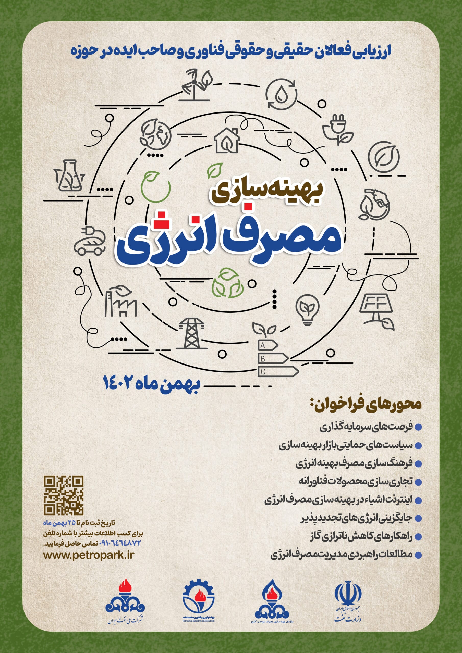 با امعان نظر به تاكيدات مقام معظم رهبري بر صرفهجويي و كاهش مستمر شاخص شدت انرژي كشور و تاکید مقام محترم رئیس جمهور به منظور بهرهبرداري جدي از توان و ظرفيت نقشآفريني شركتهاي دانشبنيان و فناور داخلي در حوزه مدیریت بهینه و مصرف انرژي كشور؛ وزارت نفت مدنظر دارد فراخواني با همکاری پارک فناوری و نوآوری صنعت نفت، معاونت علمی، فناوری و اقتصاد دانشبنیان، و شركت بهينهسازي مصرف سوخت با عنوان «ارزيابي فعالان حقیقی و حقوقی فناور و صاحب ایده در حوزه بهينهسازي مصرف انرژي» در دی ماه سال 1402 برگزار نماید.
